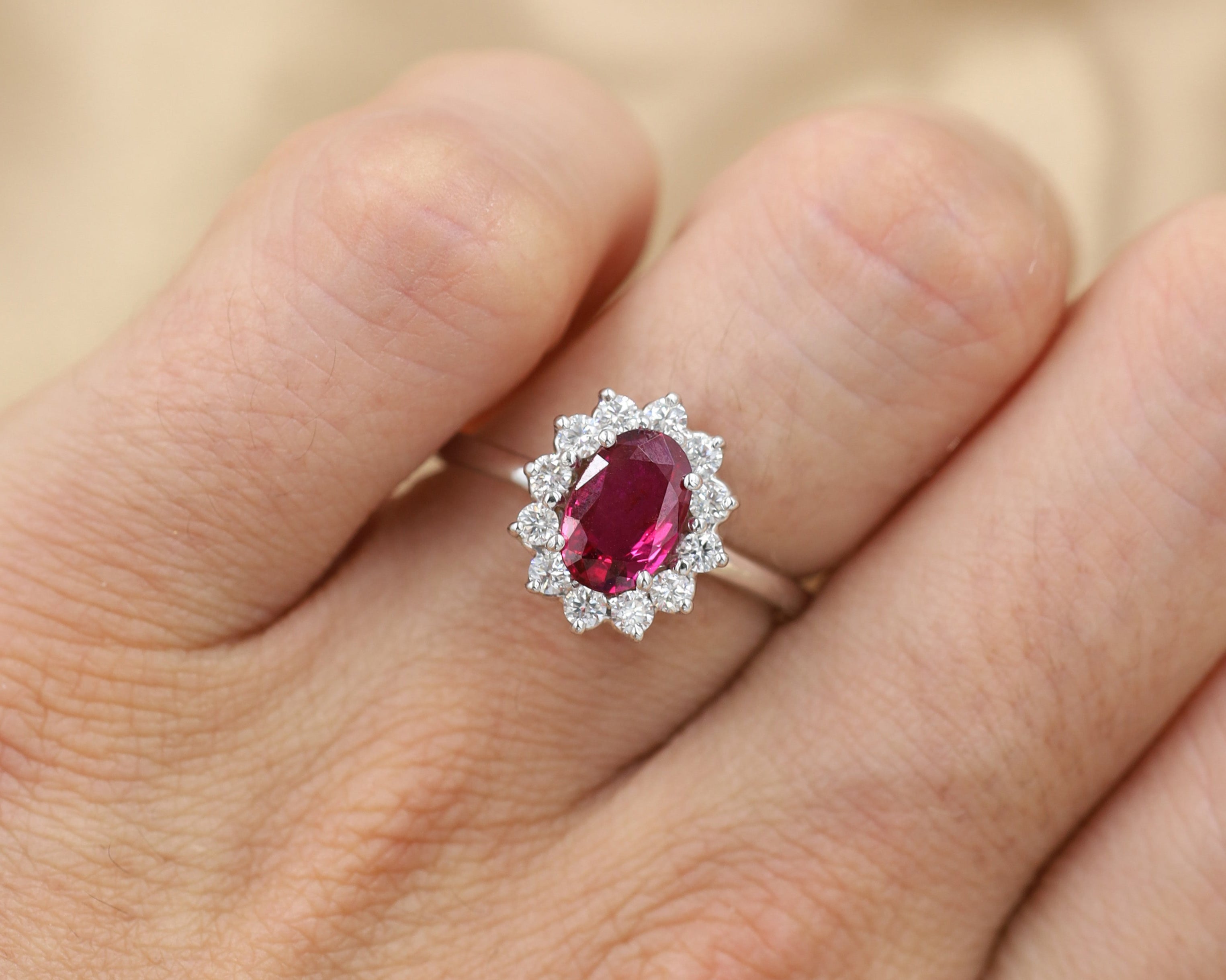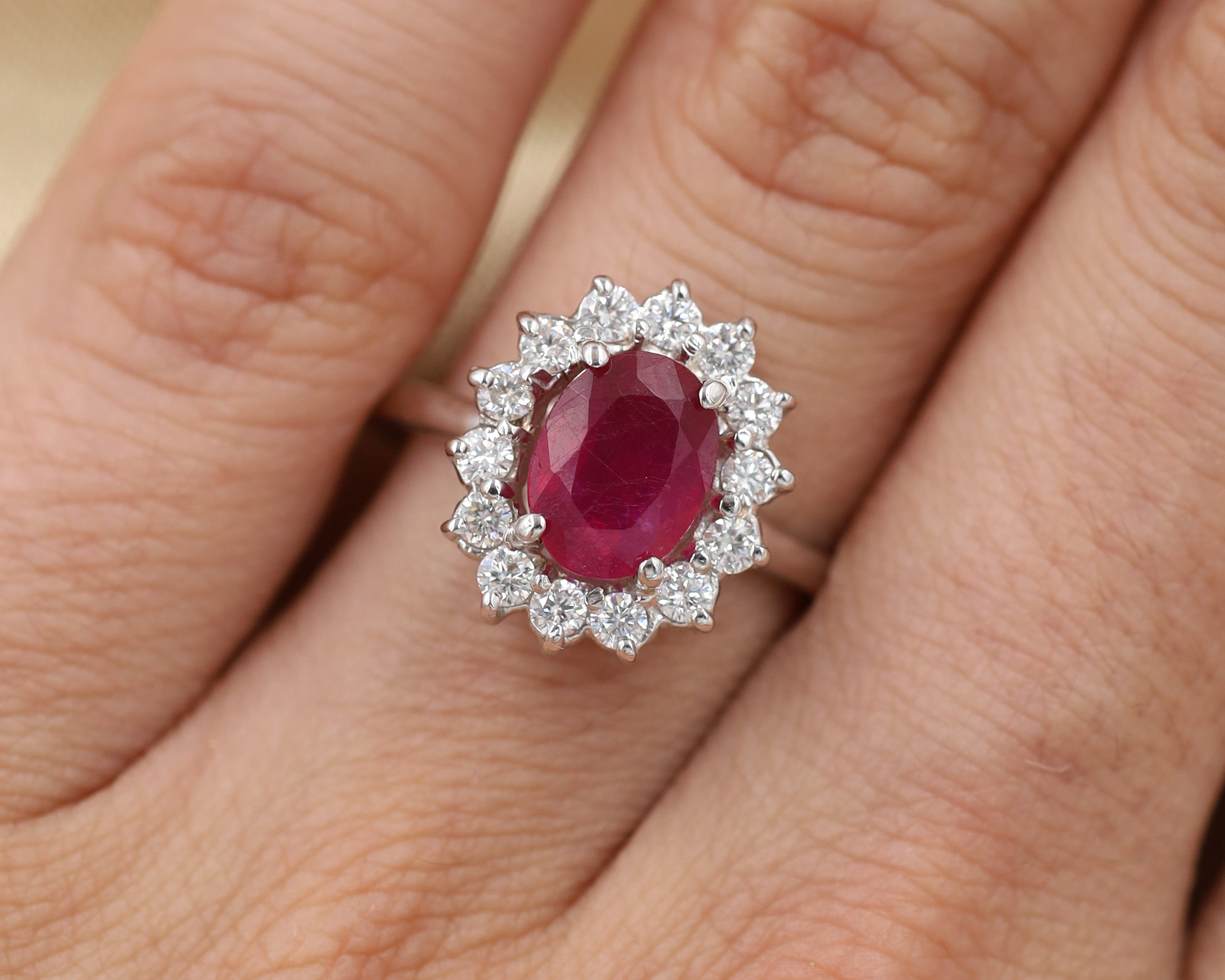 Anillo Oro Blanco Rubí 2.00 ct y Diamantes Halo .42 ctw