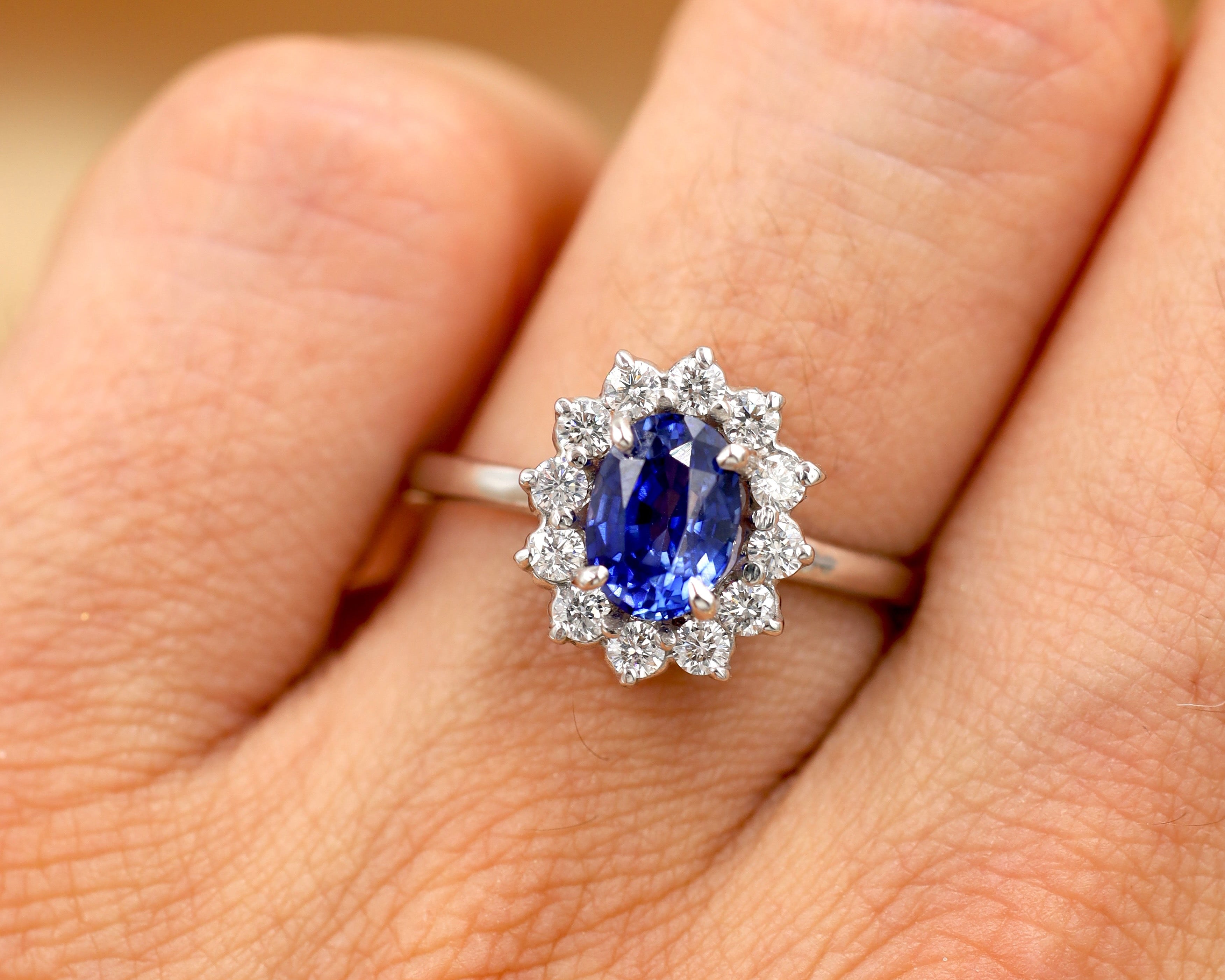Anillo Oro Blanco Zafiro 1.00 ct y Diamantes Halo .36 ctw