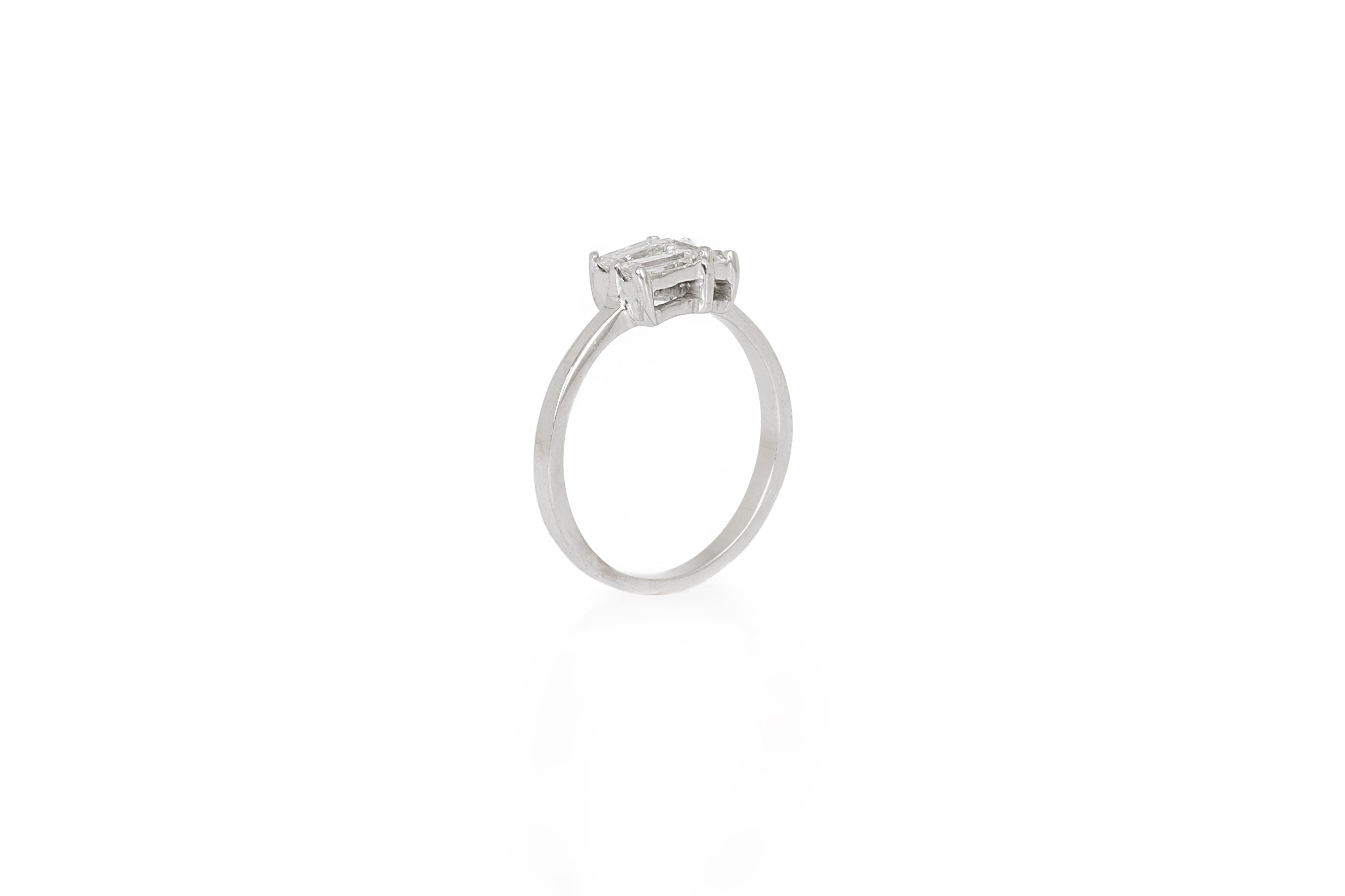 Anillo en oro blanco de 14k con 3 diamantes baguettes de .20 quilates cada uno (.60 quilates en total) color G, claridad VS.