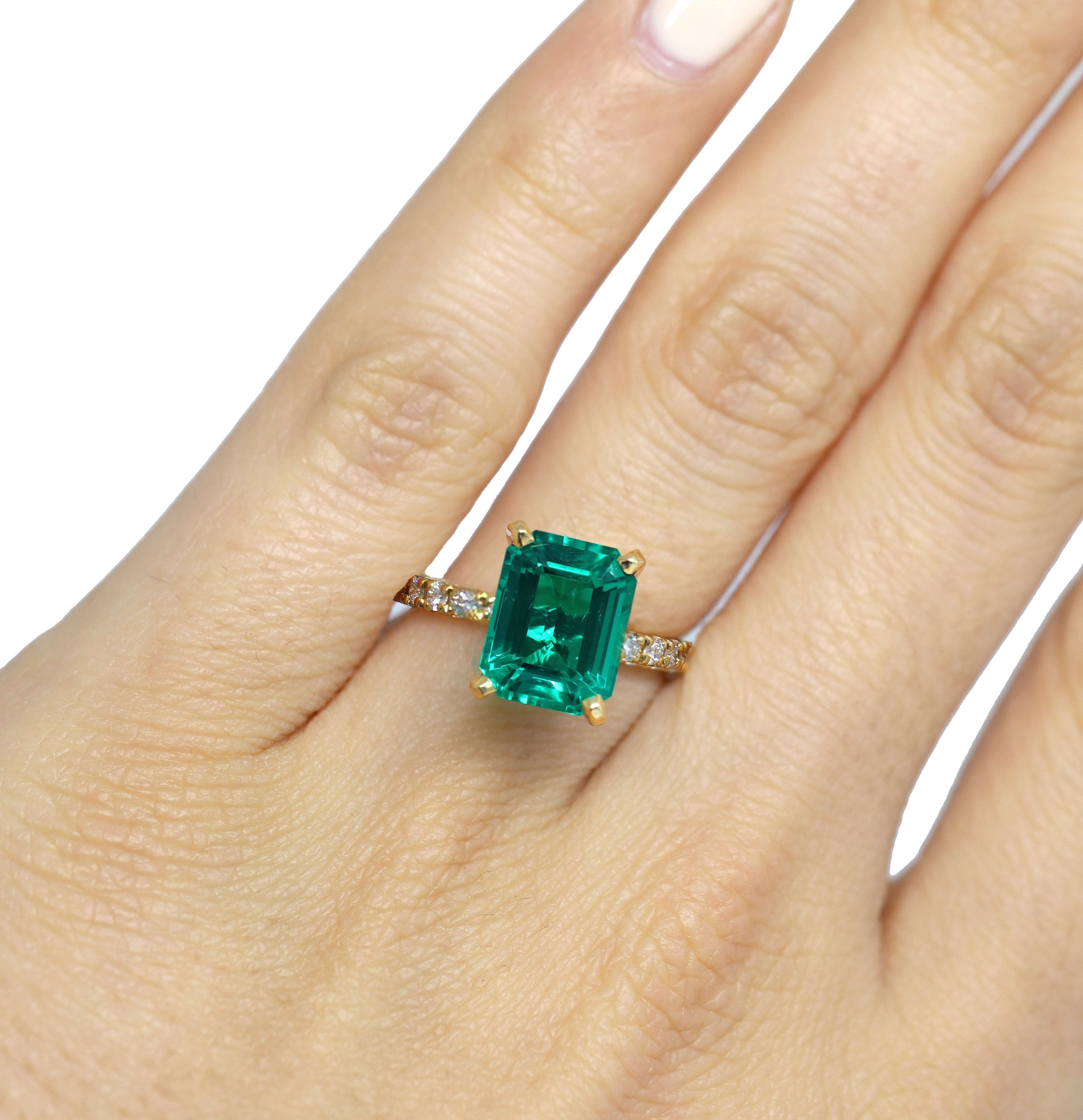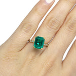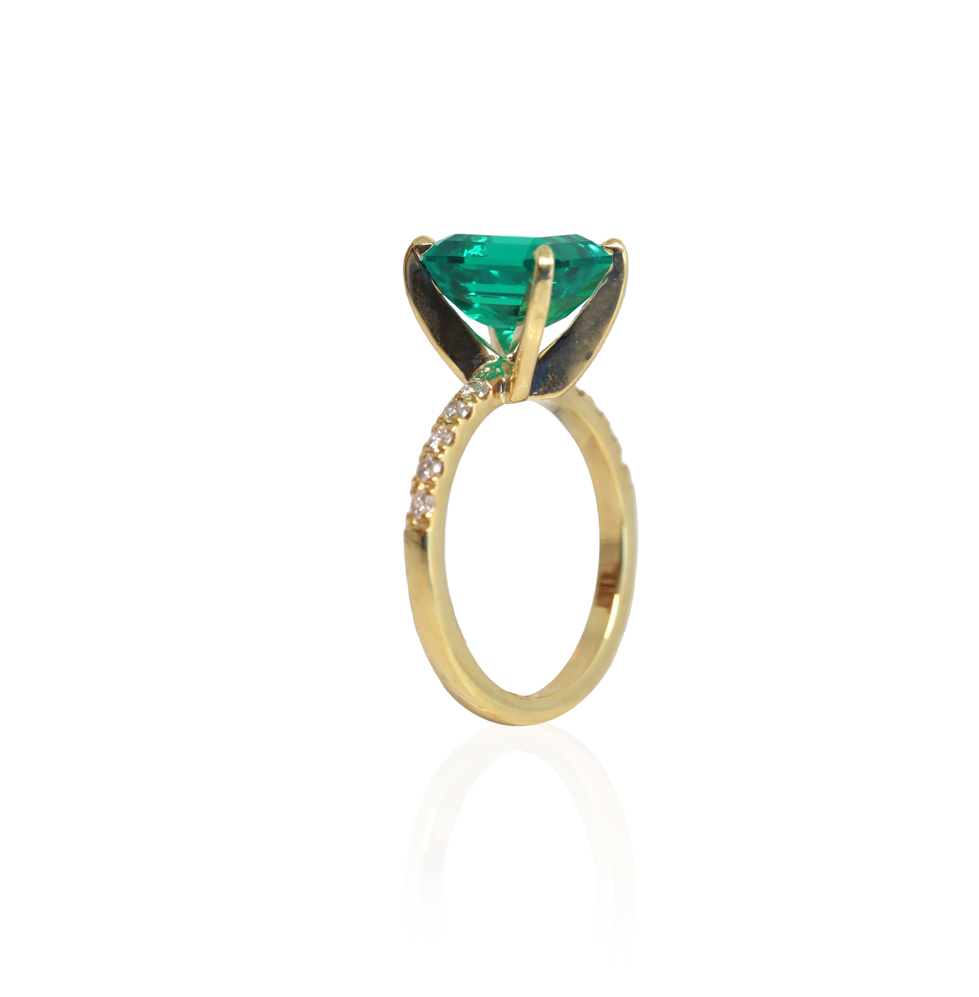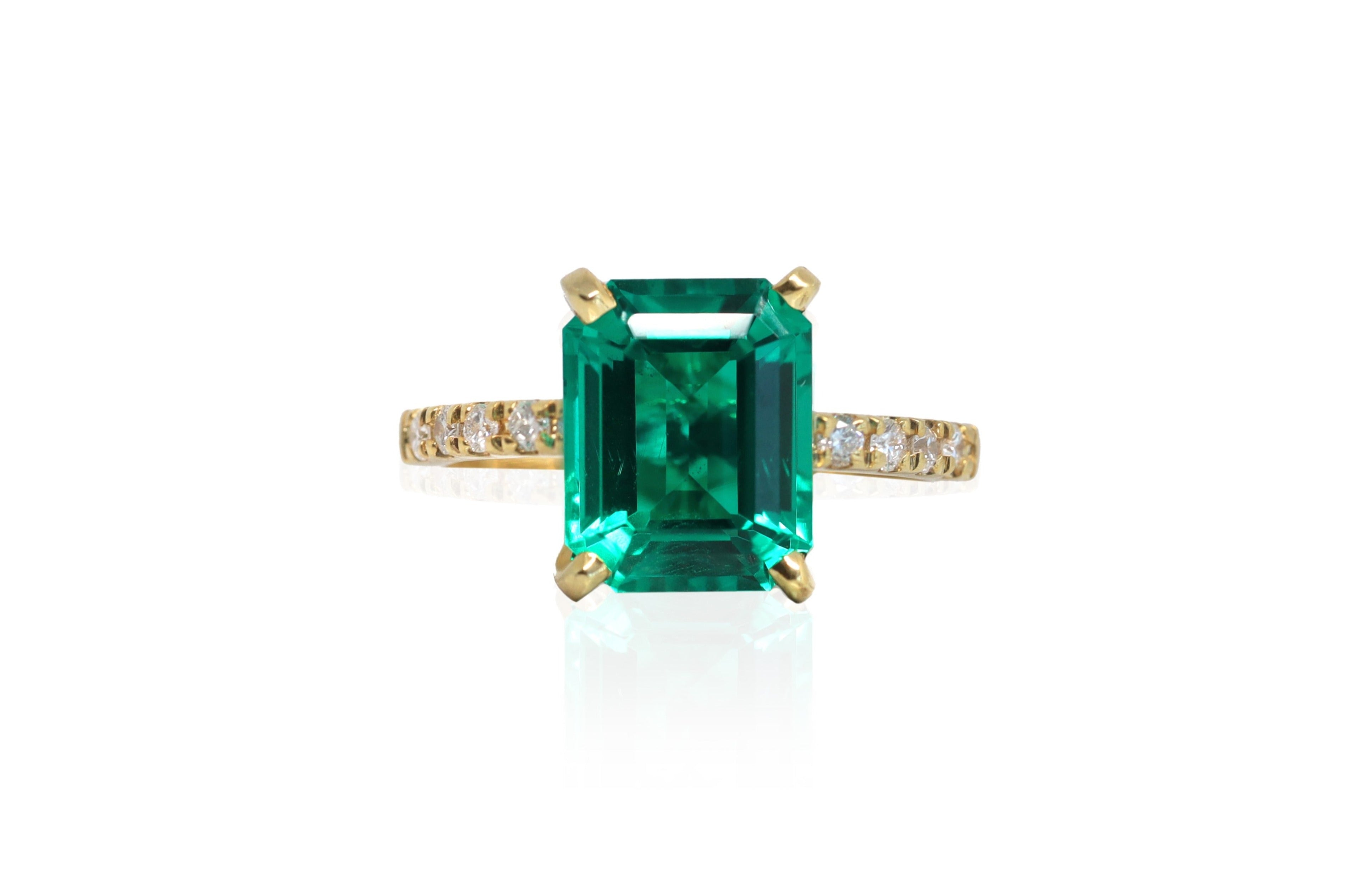 Anillo en oro amarillo de 14k con esmeralda tratada corte esmeralda de 3.00 quilates y diamantes laterales de .02 ct cada uno.