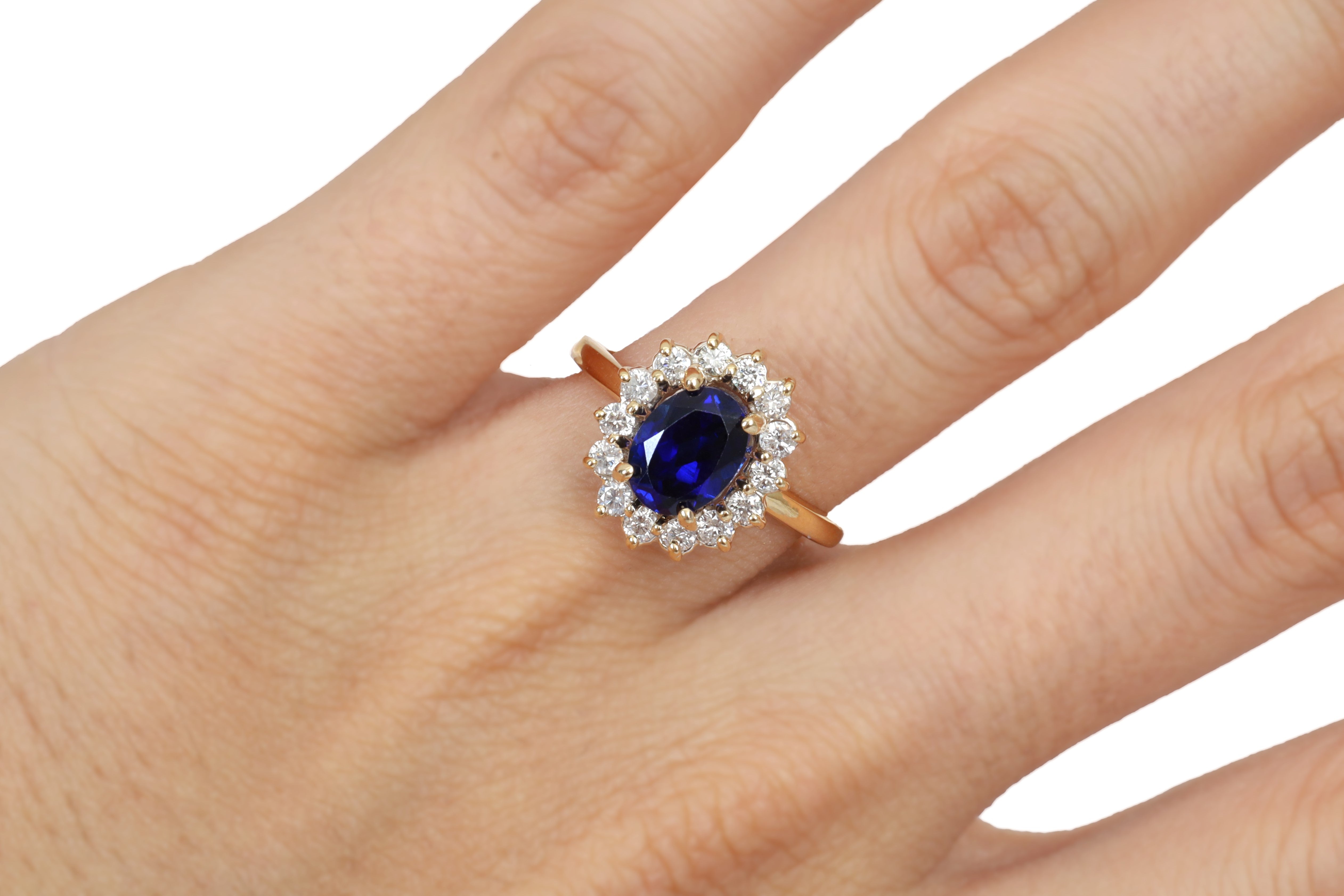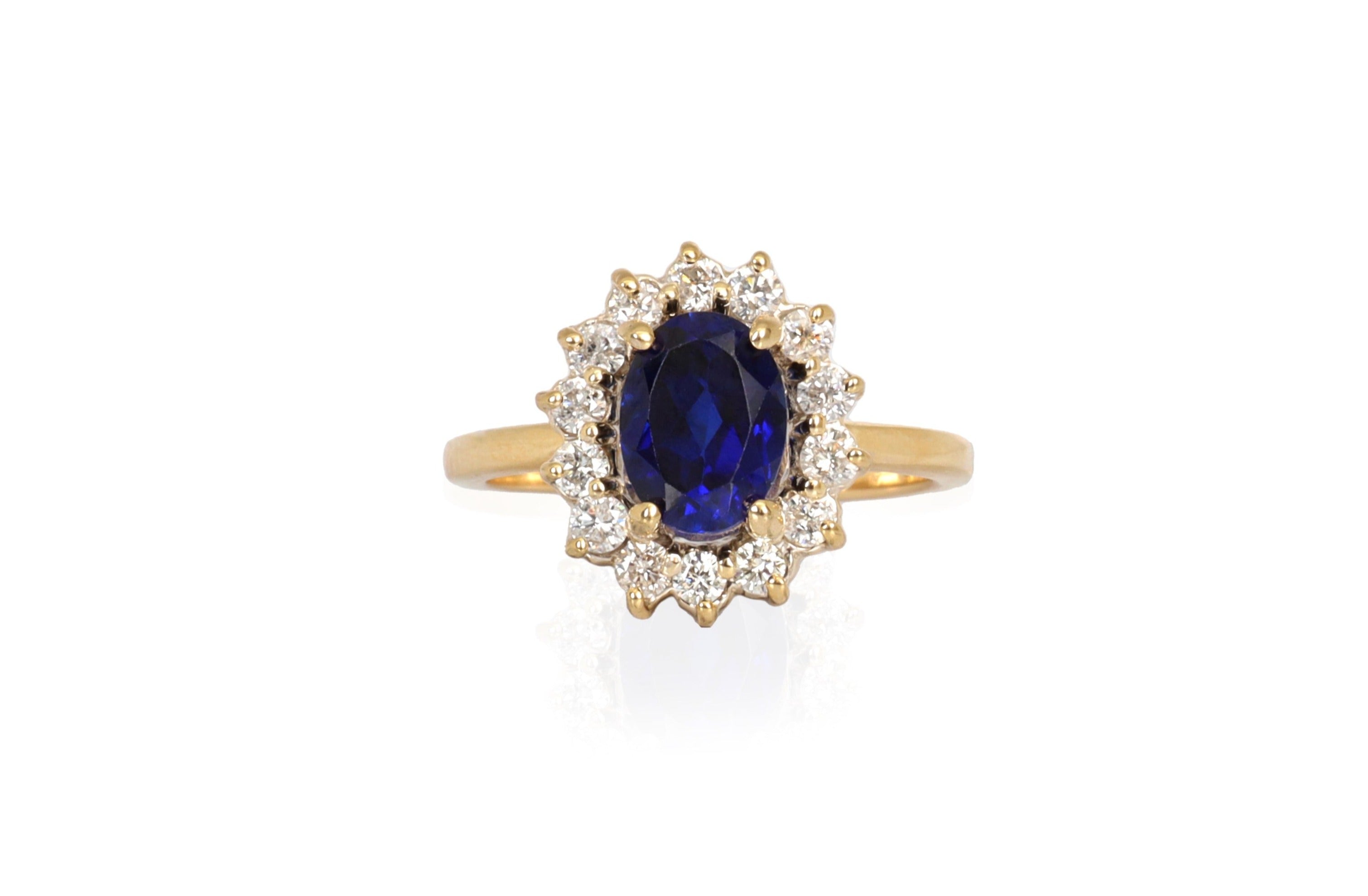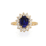Anillo en oro amarillo de 14k en forma de flor (estilo Lady Di) con zafiro corte oval de 1.80 quilates y diamantes alrededor de .03 qt cada uno, color G, claridad VS.