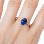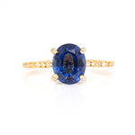 Anillo en oro amarillo de 14k, zafiro corte oval de 2.50 quilates con 12 diamantes laterales de .01 ct (6 diamantes de cada lado) color G, claridad VS.