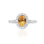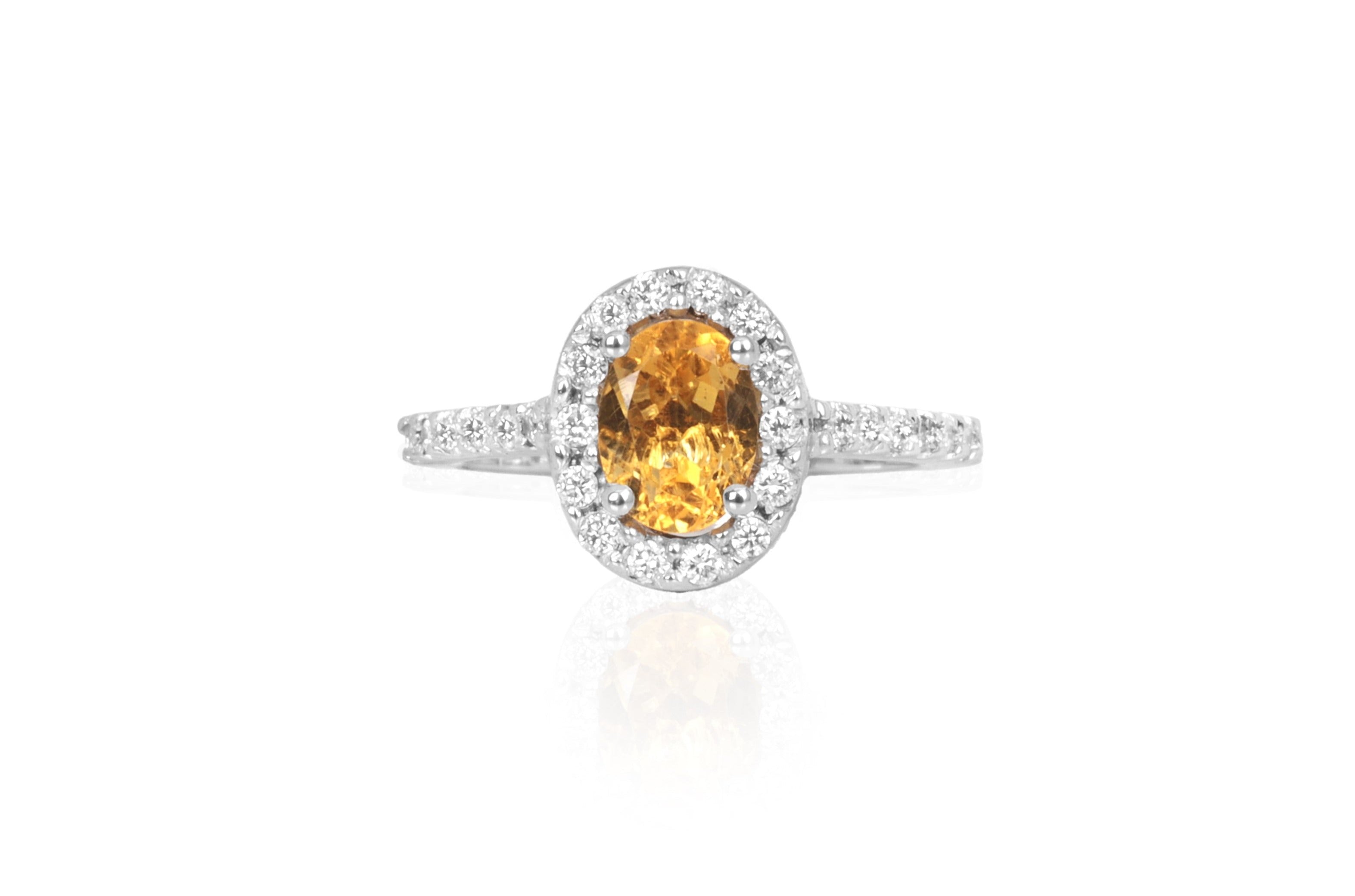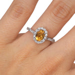 Anillo en oro blanco de 14k, citrina corte oval de 1.00 quilate. Diamantes pave + halo .28 ctw, color G, claridad VS de .01ct cada uno.