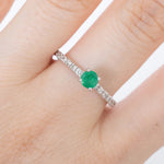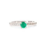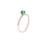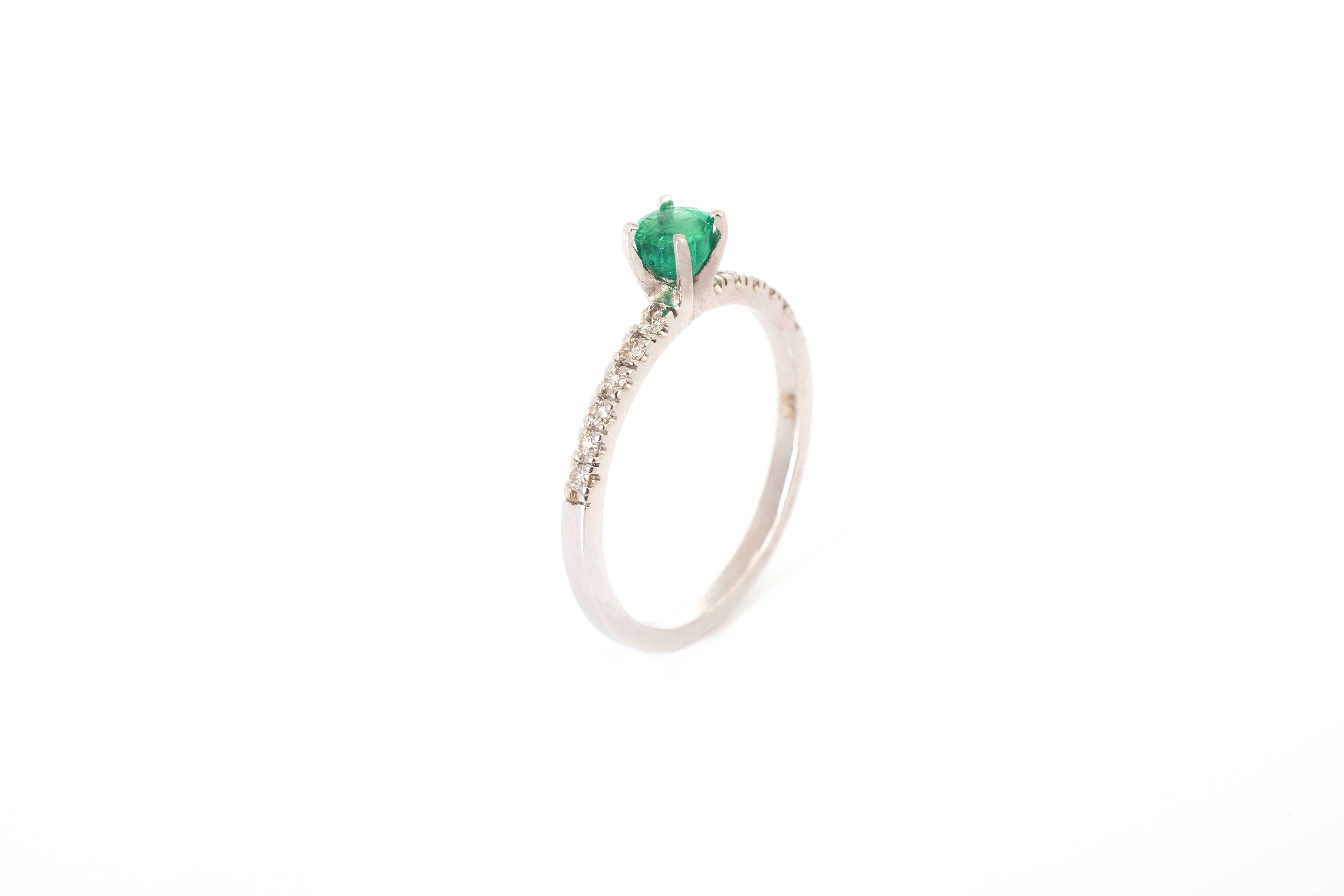 Anillo en oro blanco de 14k, esmeralda natural corte redondo de .40 quilates con 12 diamantes laterales de .01 ct color G, claridad VS.