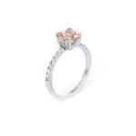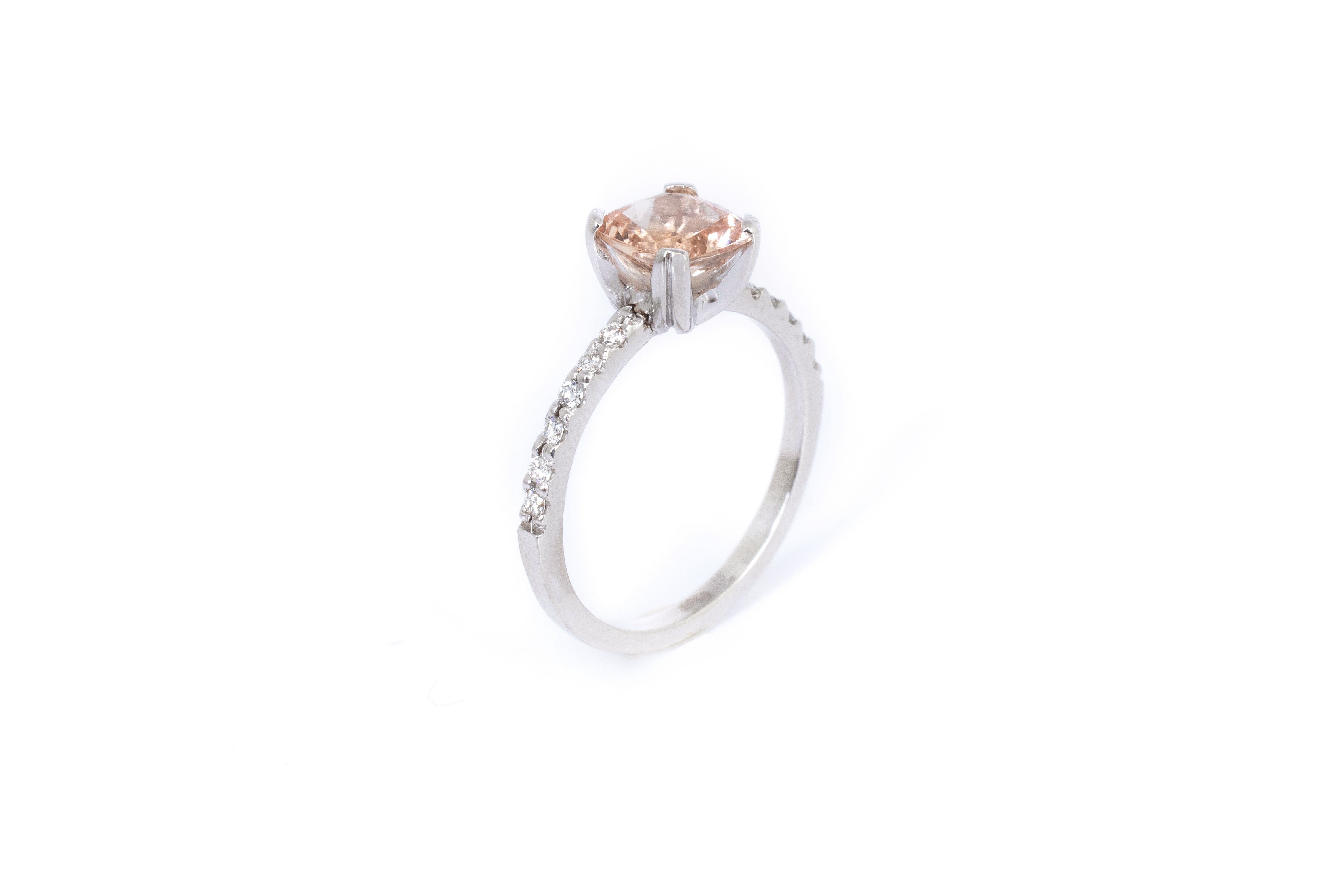 Anillo en oro blanco de 14k con Morganita de 1.65 carats y 12 diamantes laterales de .01 ct (6 de cada lado) color G, claridad VS.
