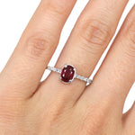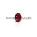Anillo en oro blanco de 14k, rubí (piedra de nacimiento de Julio) corte oval de 1.00 quilate con 12 diamantes laterales de .01 ct (6 diamantes de cada lado) color G, claridad VS.