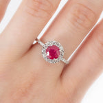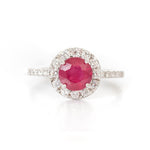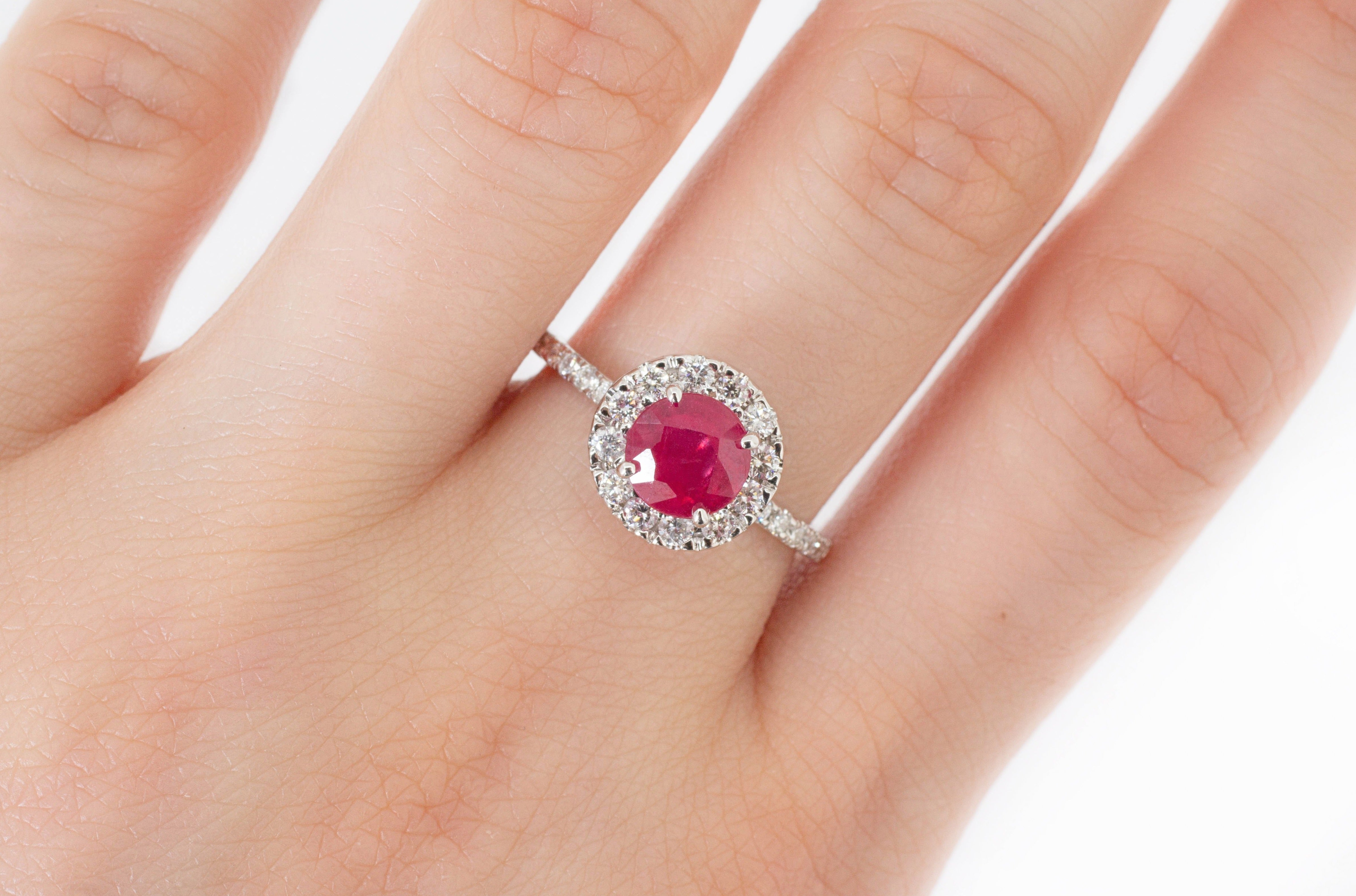 Anillo en oro blanco de 14k, rubí corte redondo de 1.30 quilates. Diamantes montadura .36 ctw, color G, claridad VS. 12 diamantes alrededor del rubí de .02 ct y 12 diamantes laterales de .01 ct.