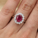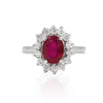 Anillo en oro blanco de 14k estilo Lady Di con rubí corte oval de 2.00 quilates y 14 diamantes alrededor de .03 ct cada uno, color G, claridad VS.