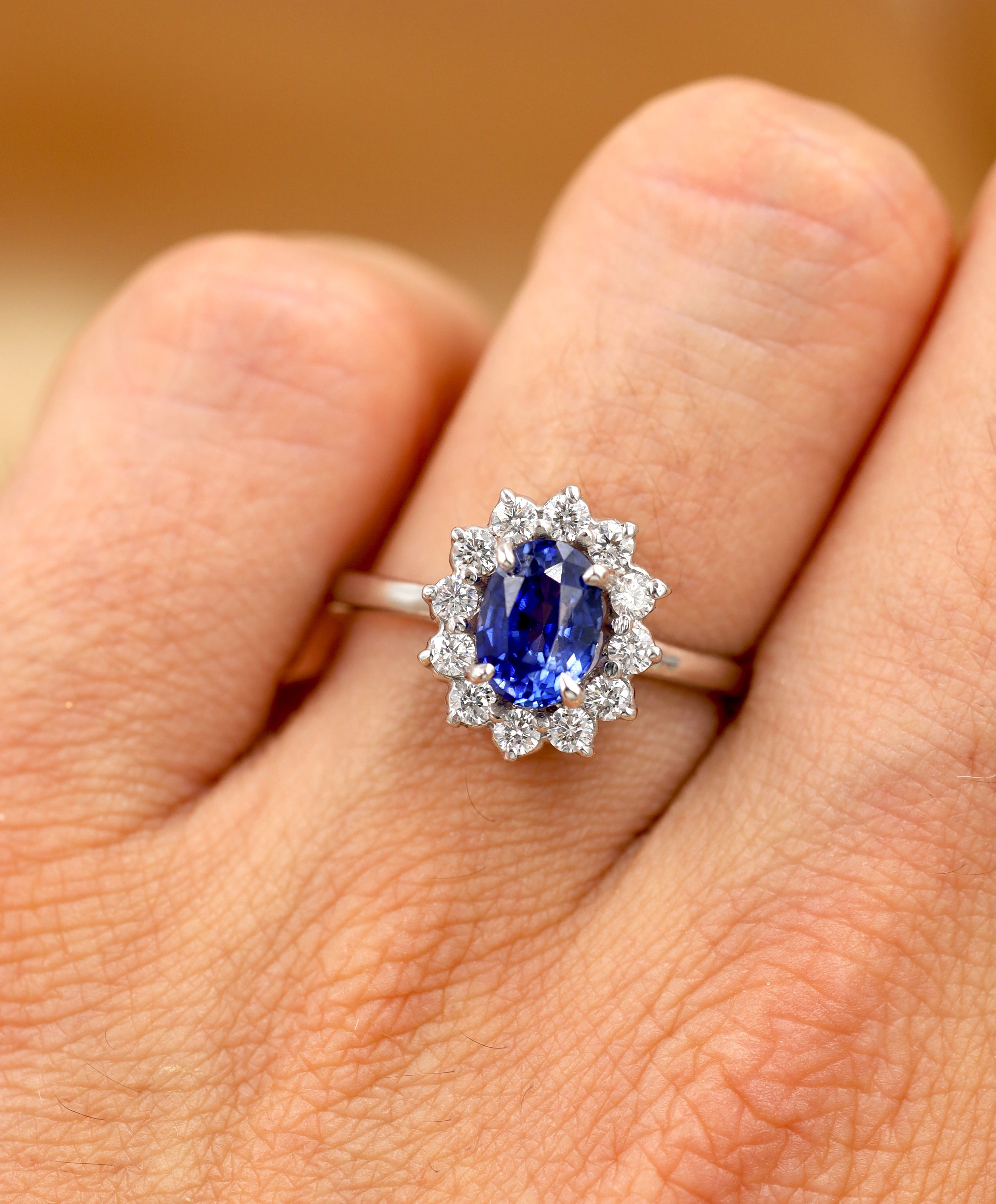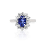 Anillo en oro blanco de 14k estilo Lady Di con zafiro corte oval de 1.00 quilate y 12 diamantes alrededor de .03 ct cada uno, color G, claridad VS.