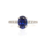 Anillo en oro blanco de 14k, zafiro corte oval de 1.60 quilates con 12 diamantes laterales de .01 ct (6 diamantes de cada lado) color G, claridad VS.