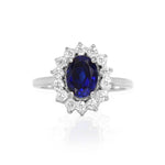 Anillo en oro blanco de 14k en forma de flor (estilo Lady Di) con zafiro corte oval de 1.80 quilates y diamantes alrededor de .03 qt cada uno, color G, claridad VS.