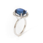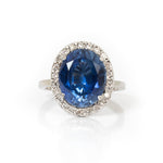 Anillo en oro blanco de 14k, zafiro corte oval de 5.00 quilates con diamantes halo de .01 ct, color G, claridad VS.