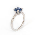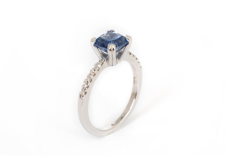 Anillo en oro blanco de 14k con zafiro natural corte cushion de 2.00 quilates con 12 diamantes laterales de .01 ct (6 de cada lado) color G, claridad VS.