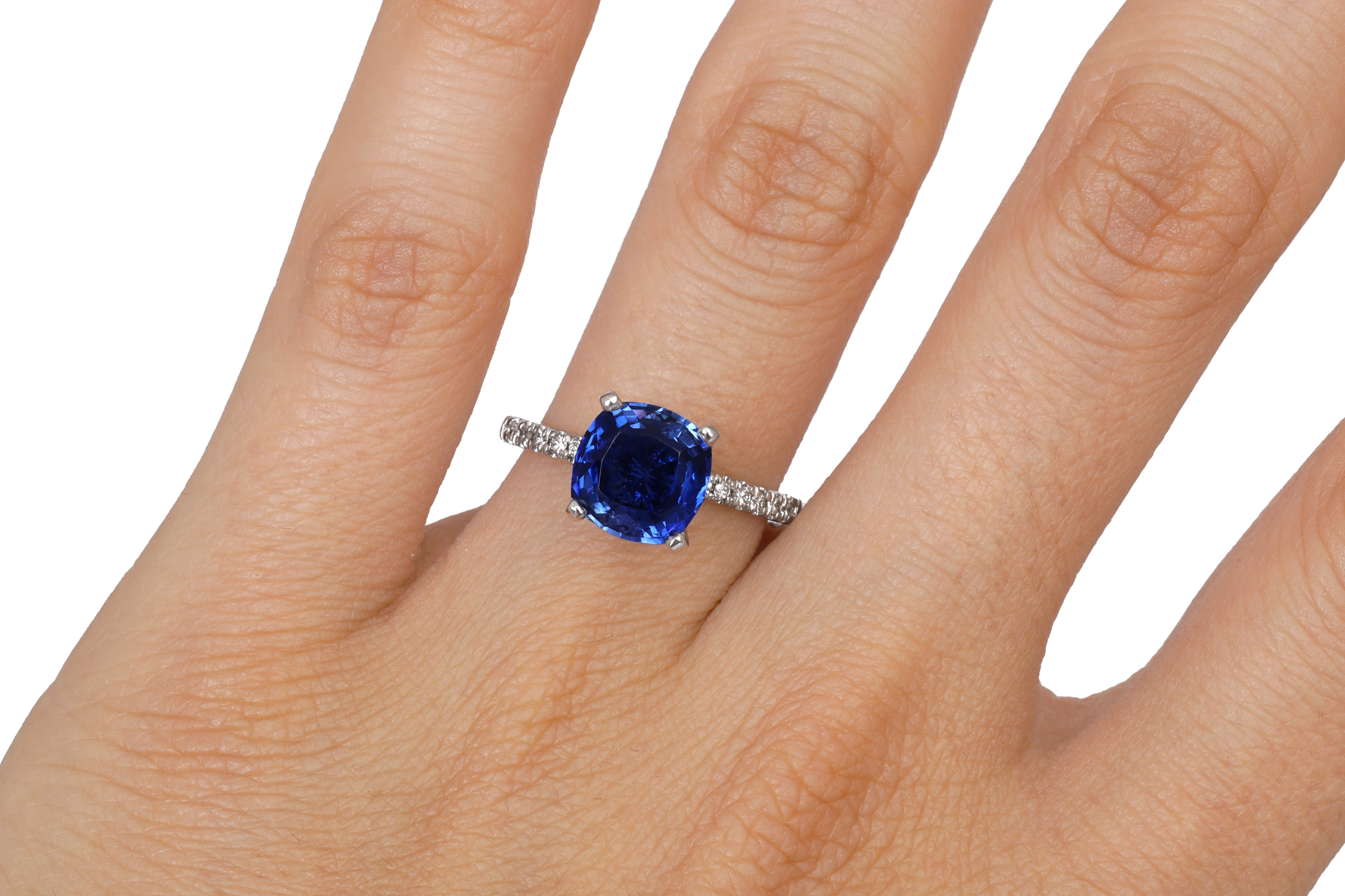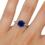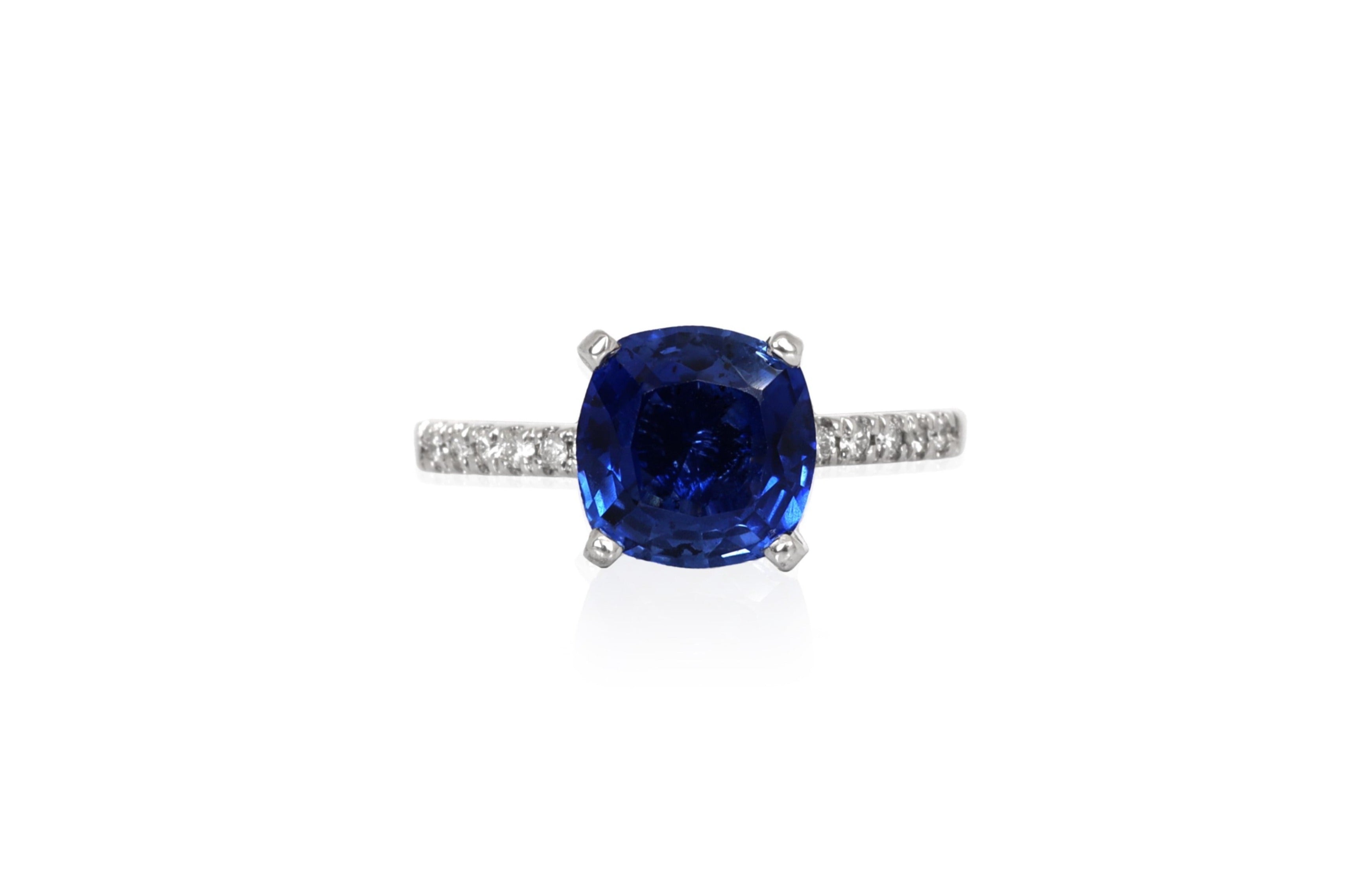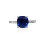 Anillo en oro blanco de 14k con zafiro natural corte cushion de 2.50 quilates con 12 diamantes laterales de .01 ct (6 de cada lado) color G, claridad VS.