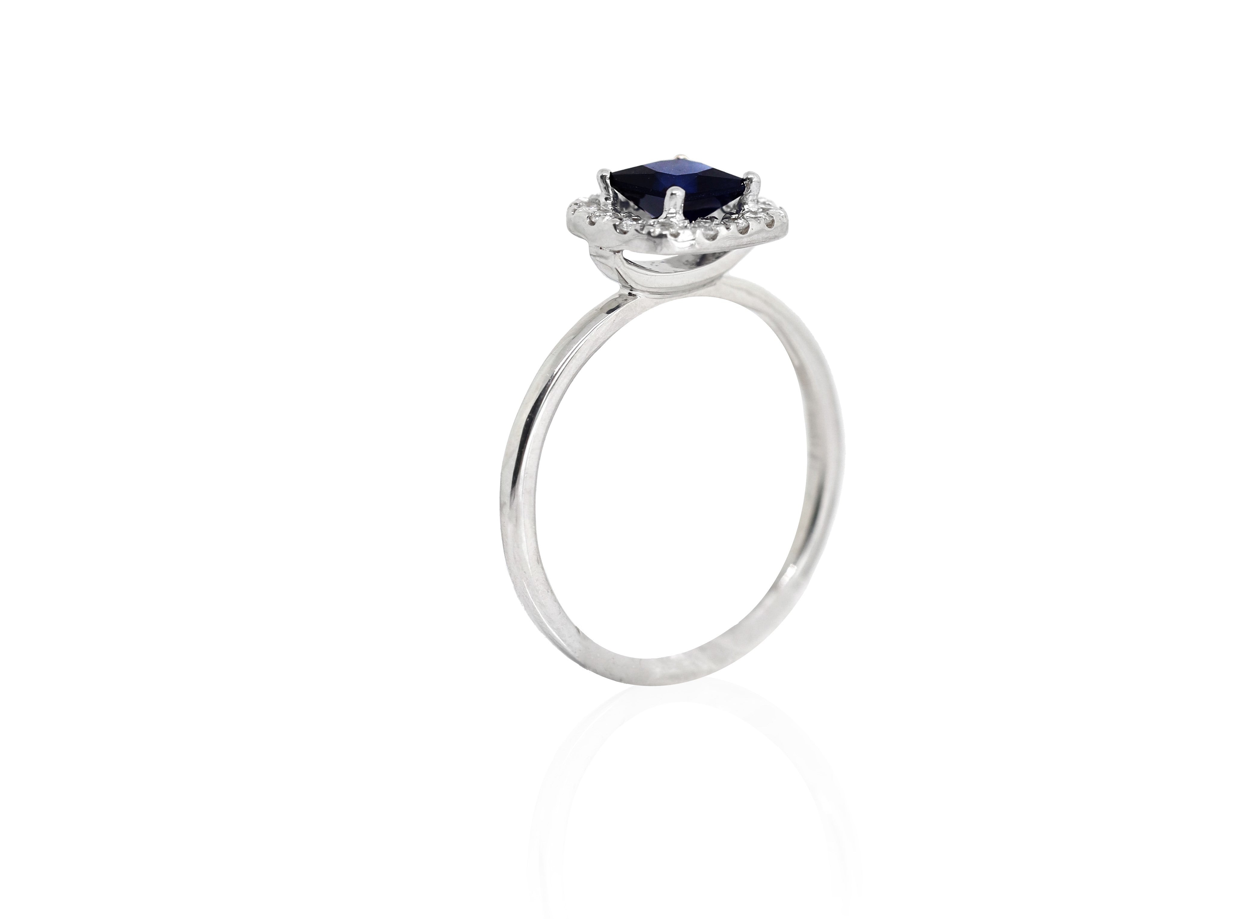 Anillo en oro blanco de 14k, zafiro corte cushion de 1.00 quilate con 16 diamantes alrededor de .01 ct, color G, claridad VS.