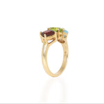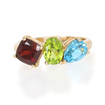 Churumbela familiar en oro amarillo 14k con granate corte cushion de 1.00 quilate (piedra nacimiento Enero), peridoto corte oval de 1.00 quilate (piedra nacimiento Agosto) y Aauamarina corte pera de 1.00 quilate (piedra nacimiento Marzo).