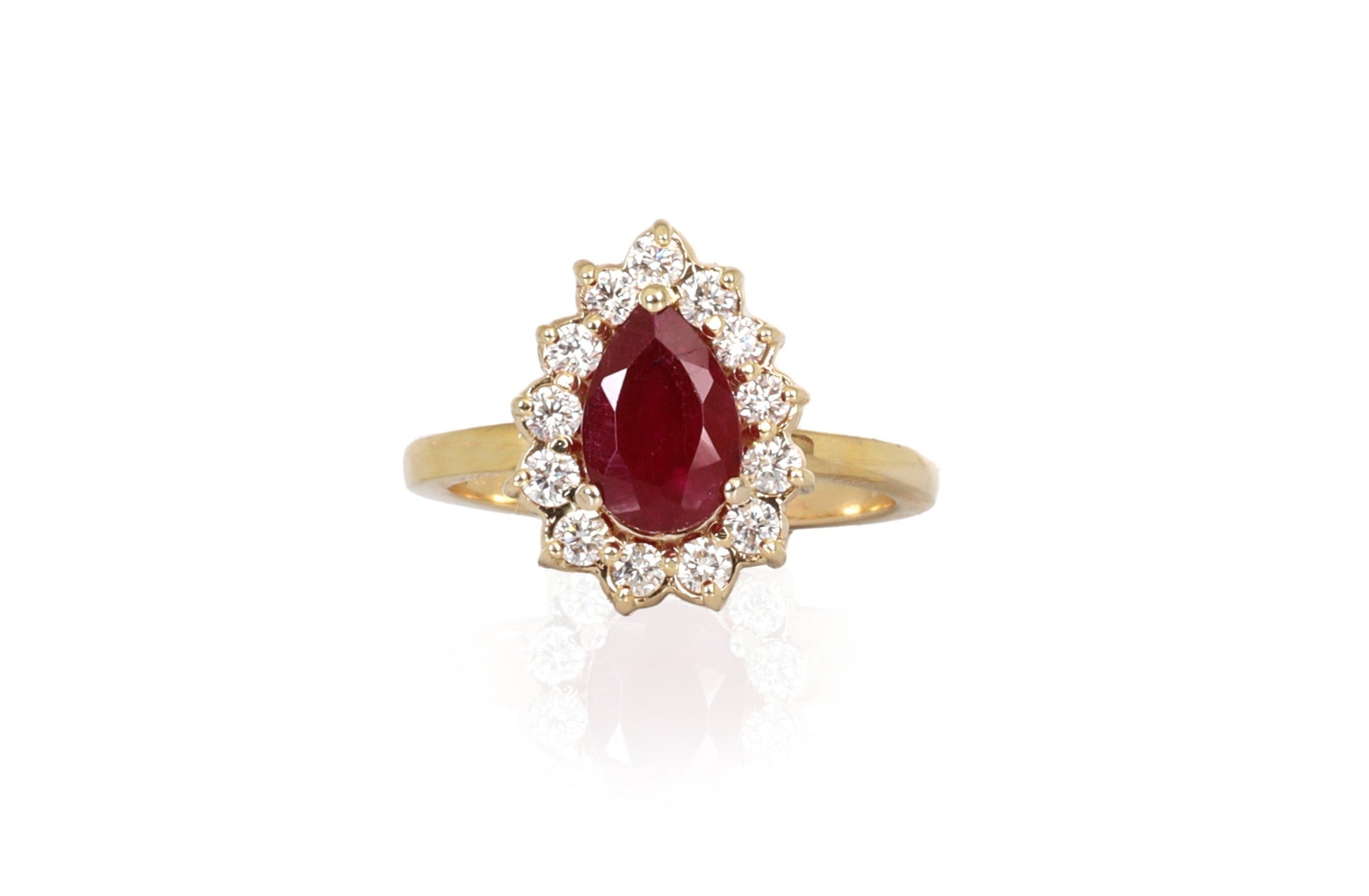 Anillo Oro Amarillo Rubí Pera 1.30 ct y Diamantes .40 ctw
