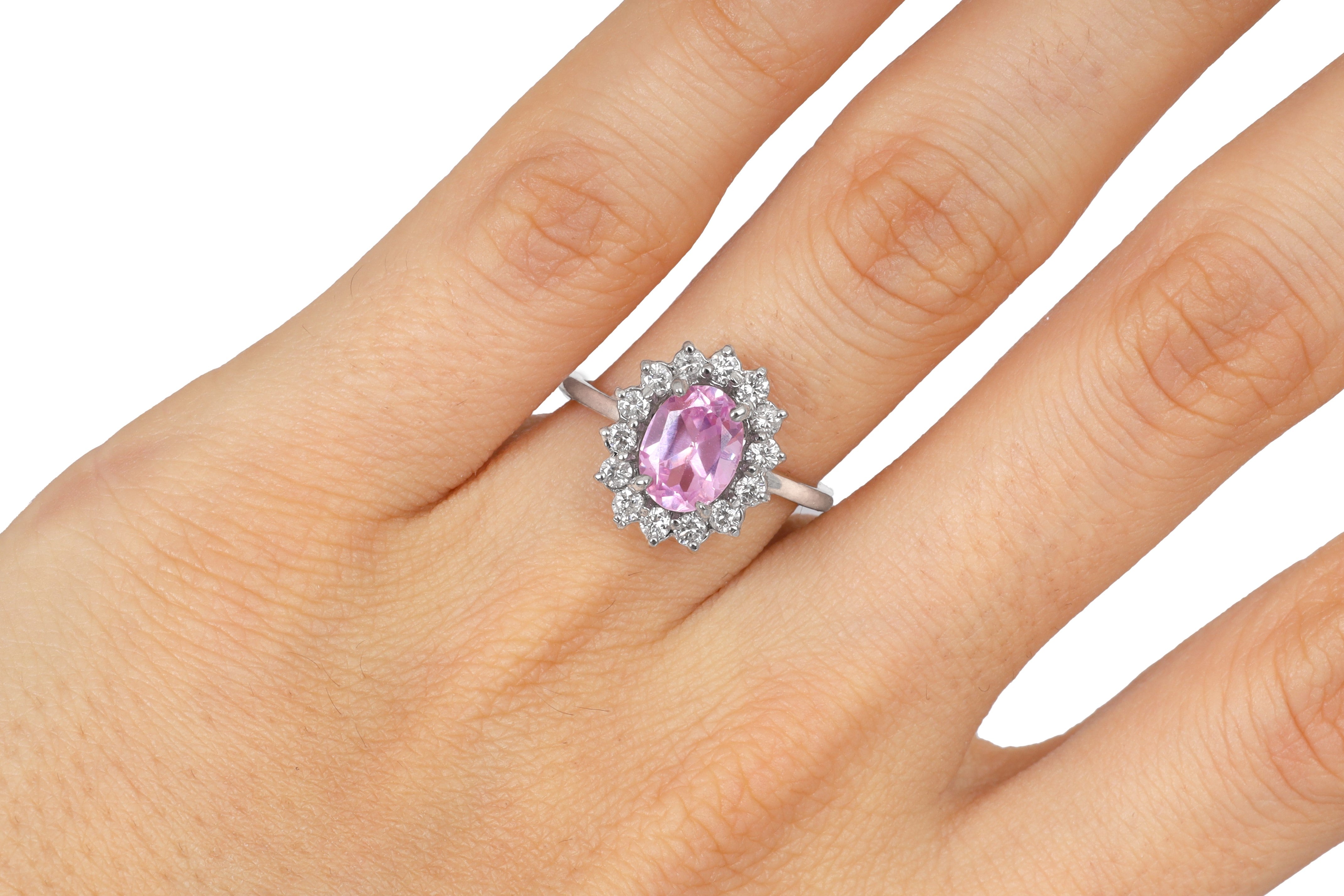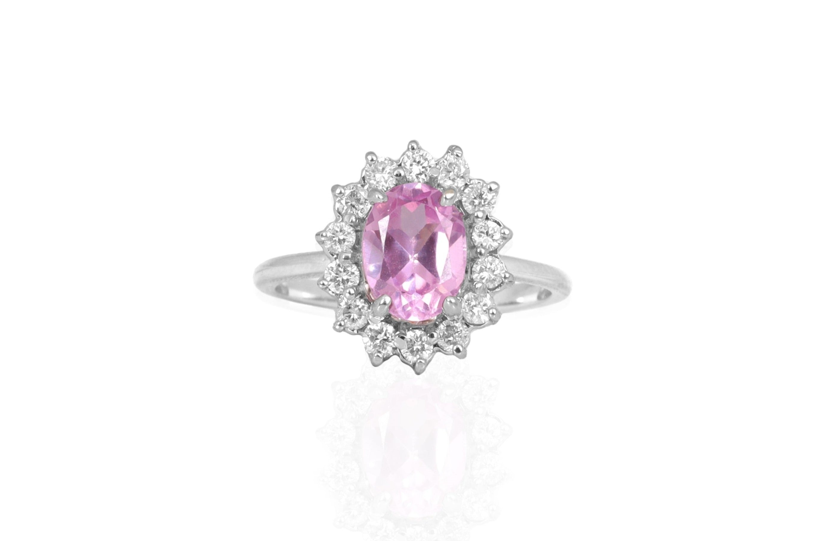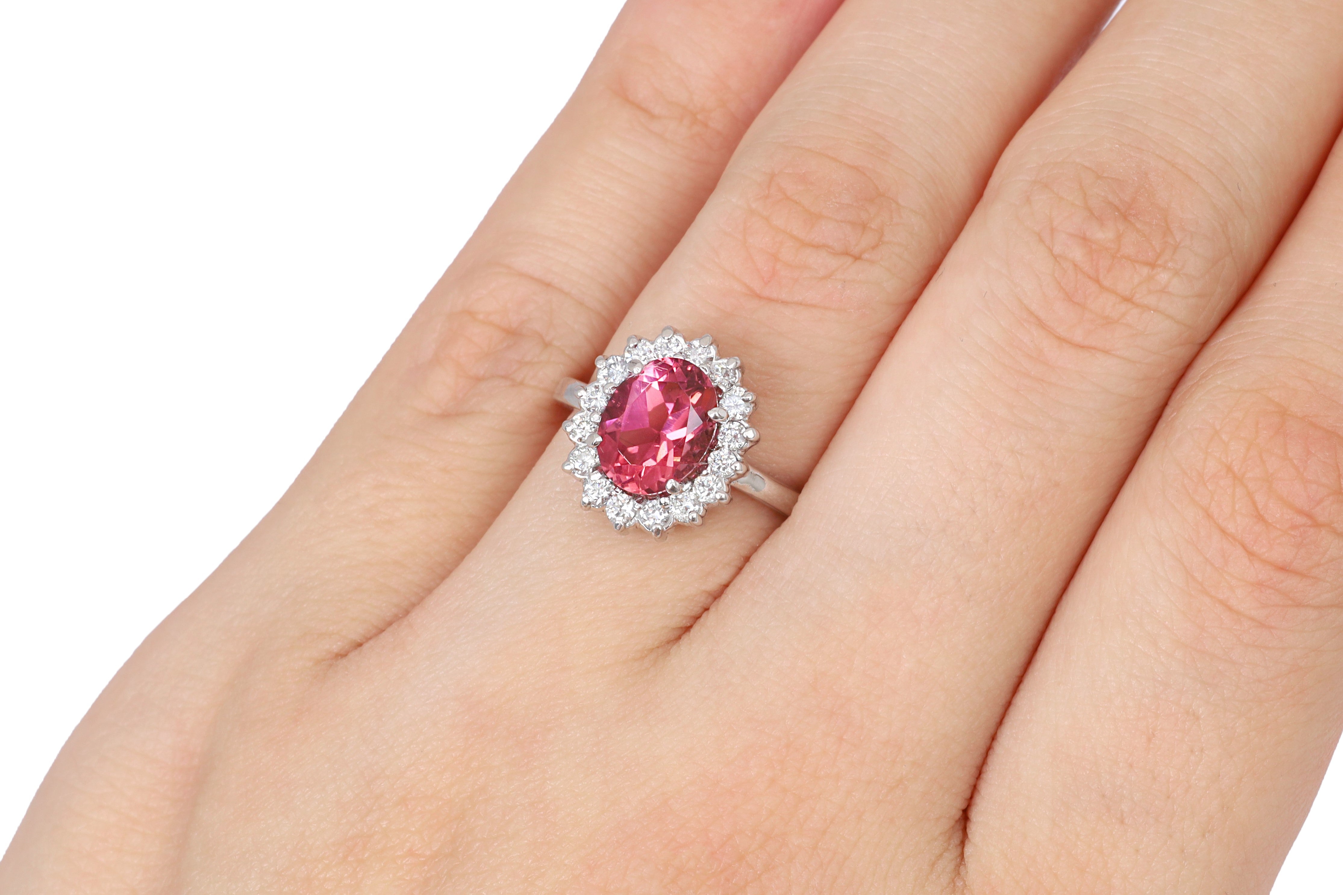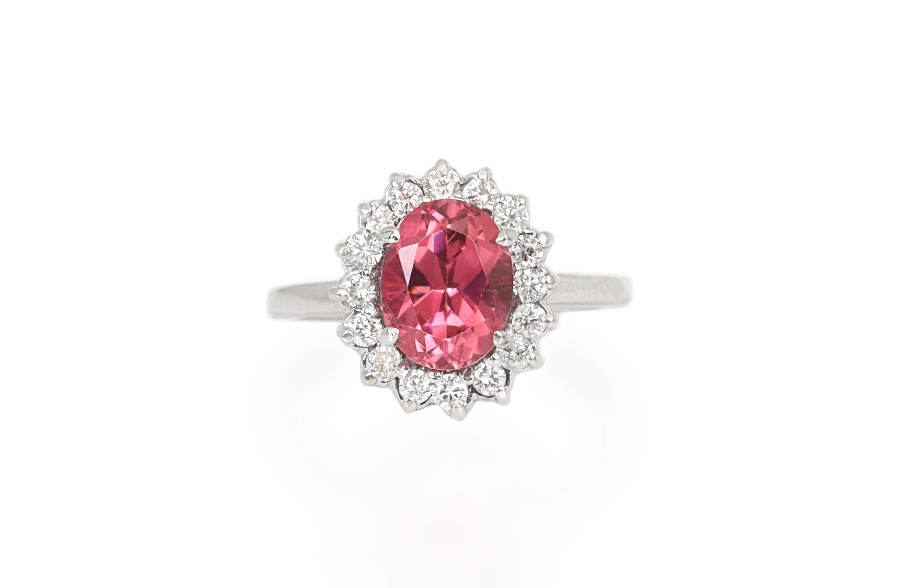 Anillo Oro Blanco Turmalina Rosa 1.70 ct y Diamantes Halo .42 ctw