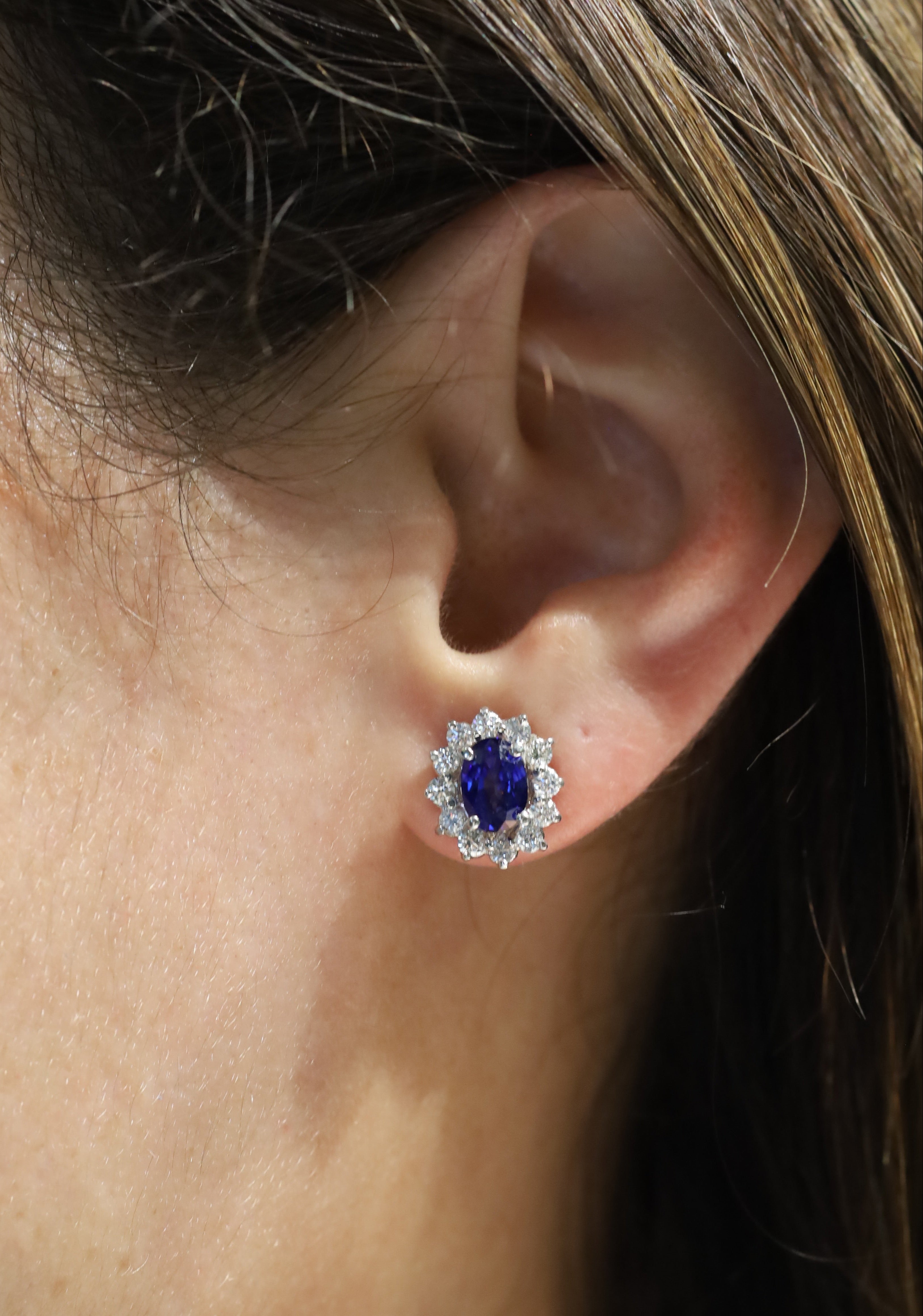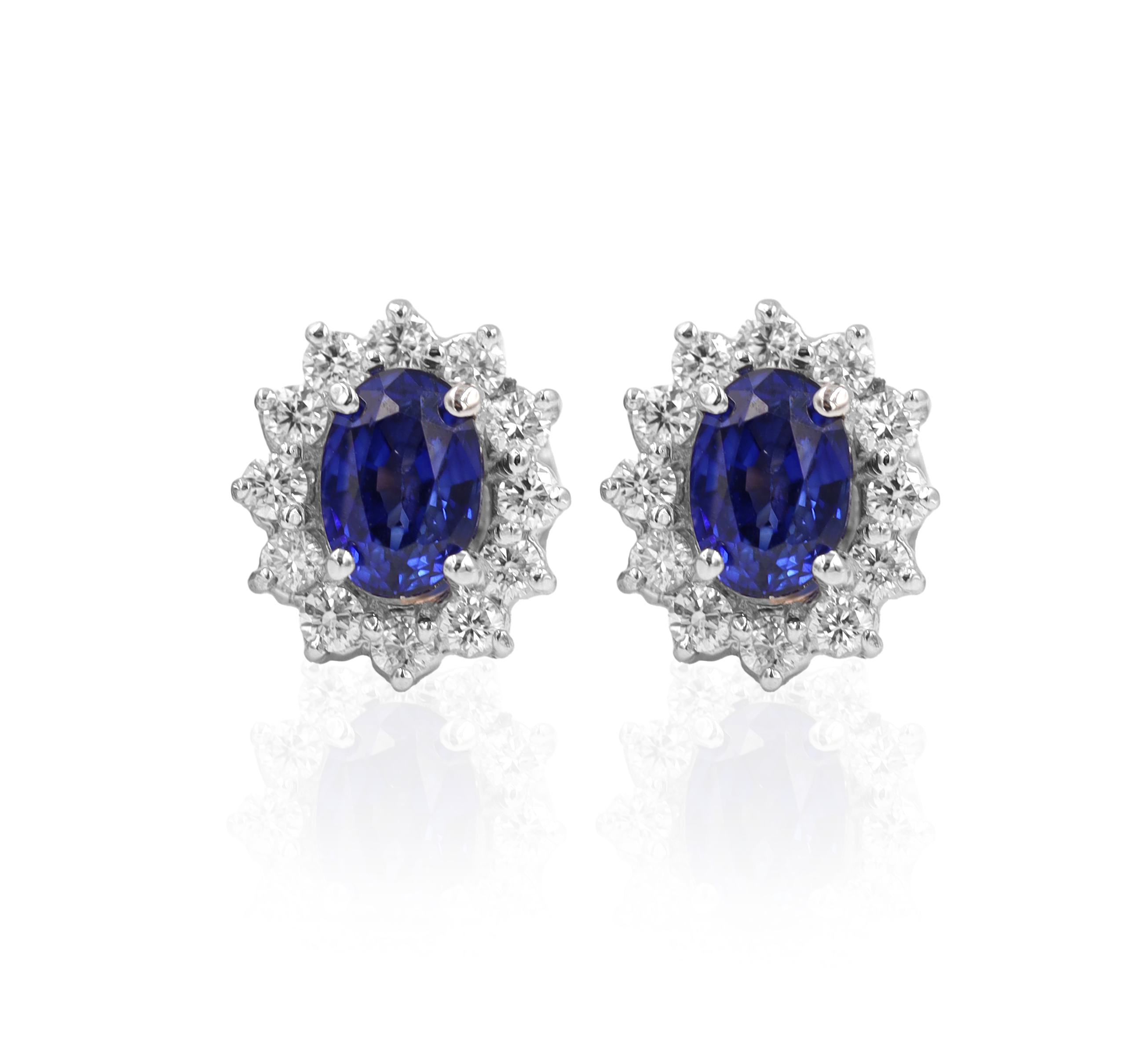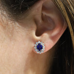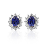 Aretes en oro blanco de 14k estilo Lady Di con zafiros de 1.00 ct cada uno y 12 diamantes de .03 ct cada uno color F-G, claridad VS.