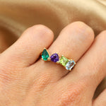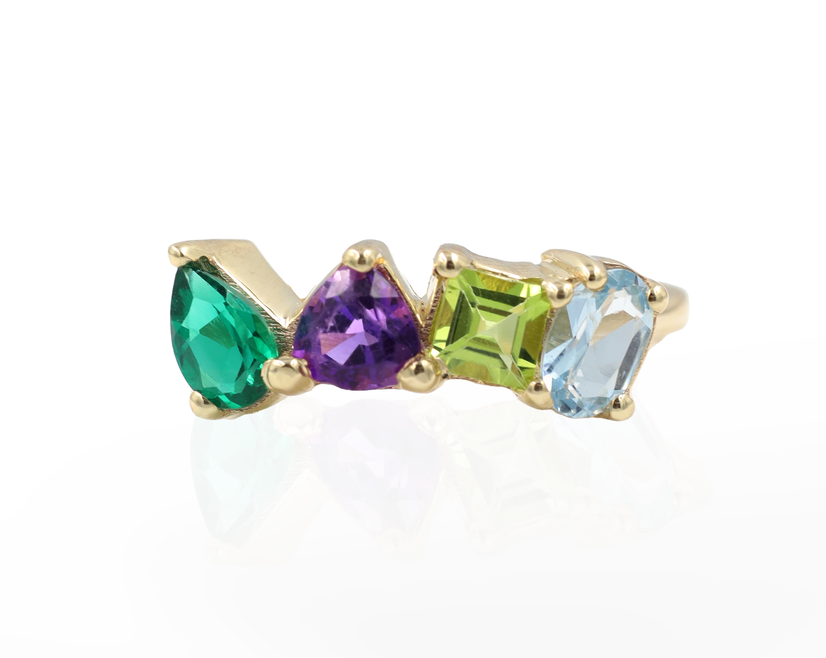 Churumbela familiar en oro amarillo de 14k con esmeralda corte pera de .35 qt (piedra nacimiento Mayo), amatista corte trillón de .35 qt (piedra nacimiento Febrero), peridoto corte princess de .35 qt (piedra nacimiento Agosto) y aguamarina corte oval de .35 qt (piedra nacimiento Marzo).