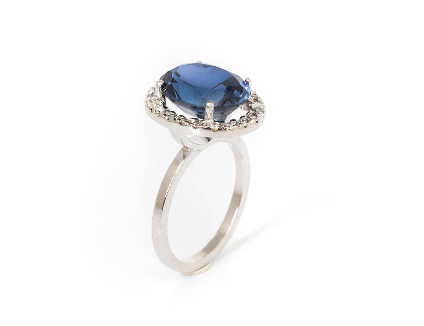 Anillo en oro blanco de 14k, zafiro corte oval de 5.00 quilates con diamantes halo de .01 ct, color G, claridad VS.