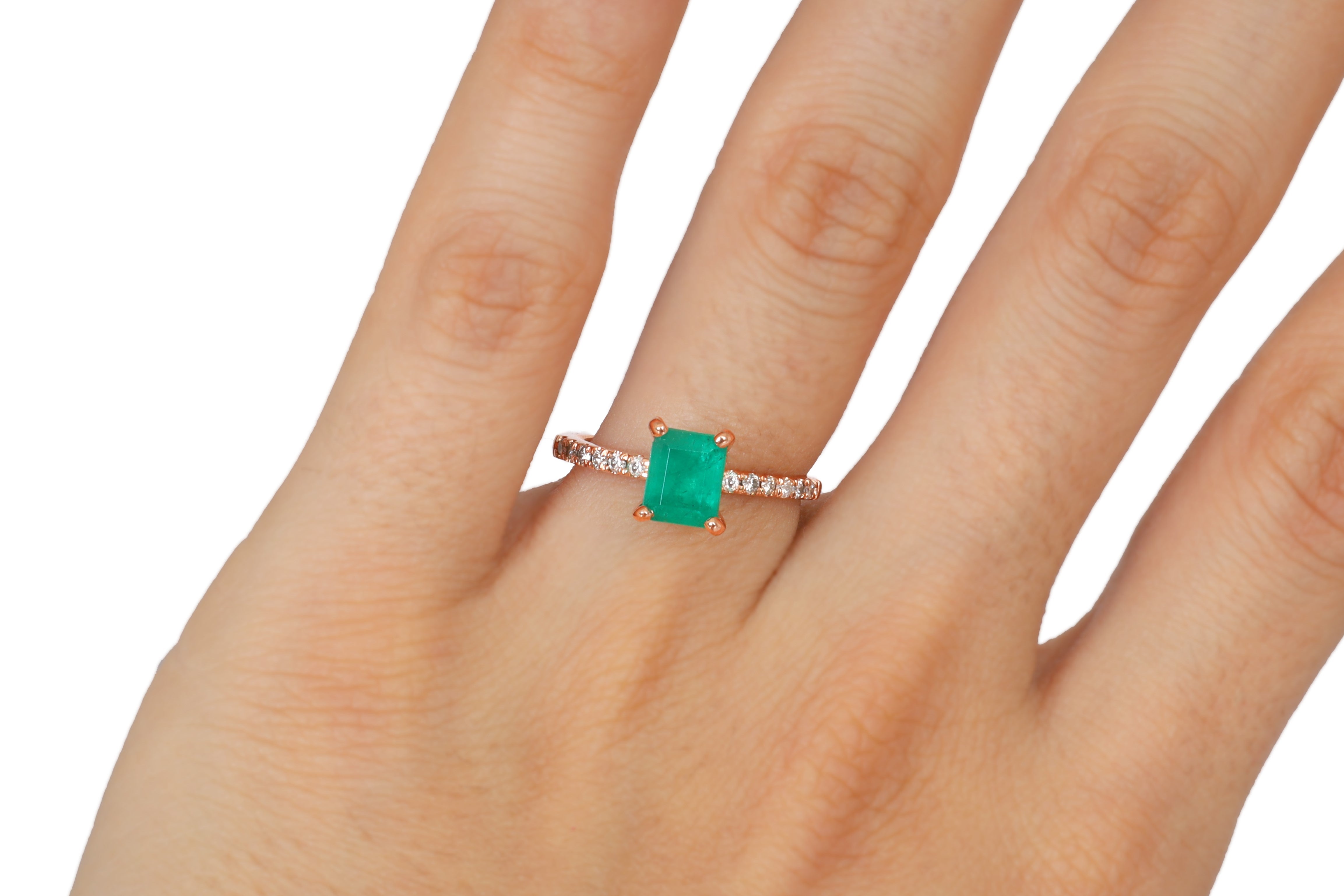 Anillo Oro Rosa Esmeralda 1.10 ct y Diamante Lateral .12 ctw