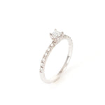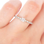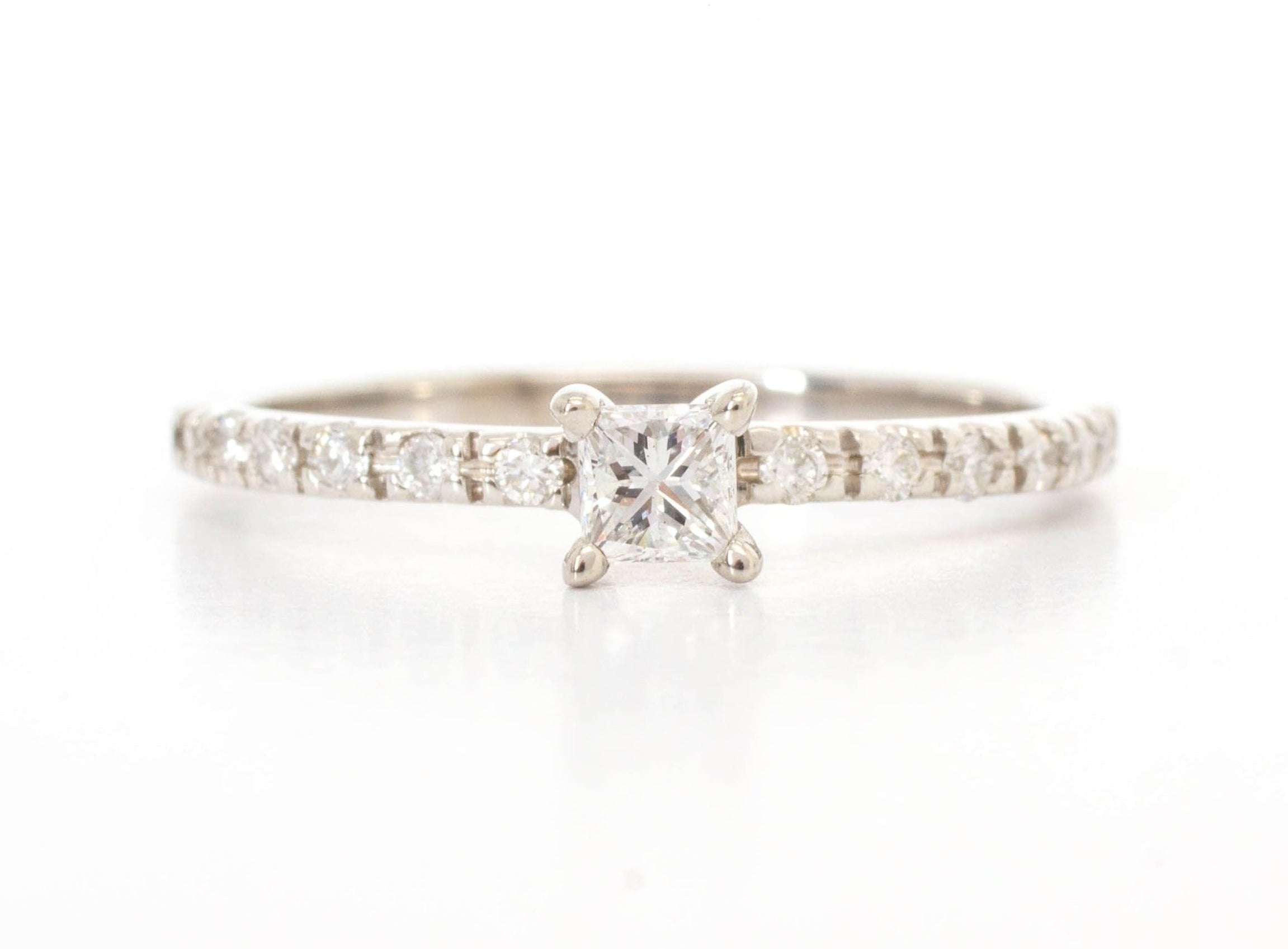 Anillo de compromiso en oro blanco de 14k, diamante central corte Princess .15 ct, Color G, Claridad VS2, Corte Muy Bueno. Diamantes Laterales .12 ctw (6 diamantes laterales de cada lado de .01 ct).