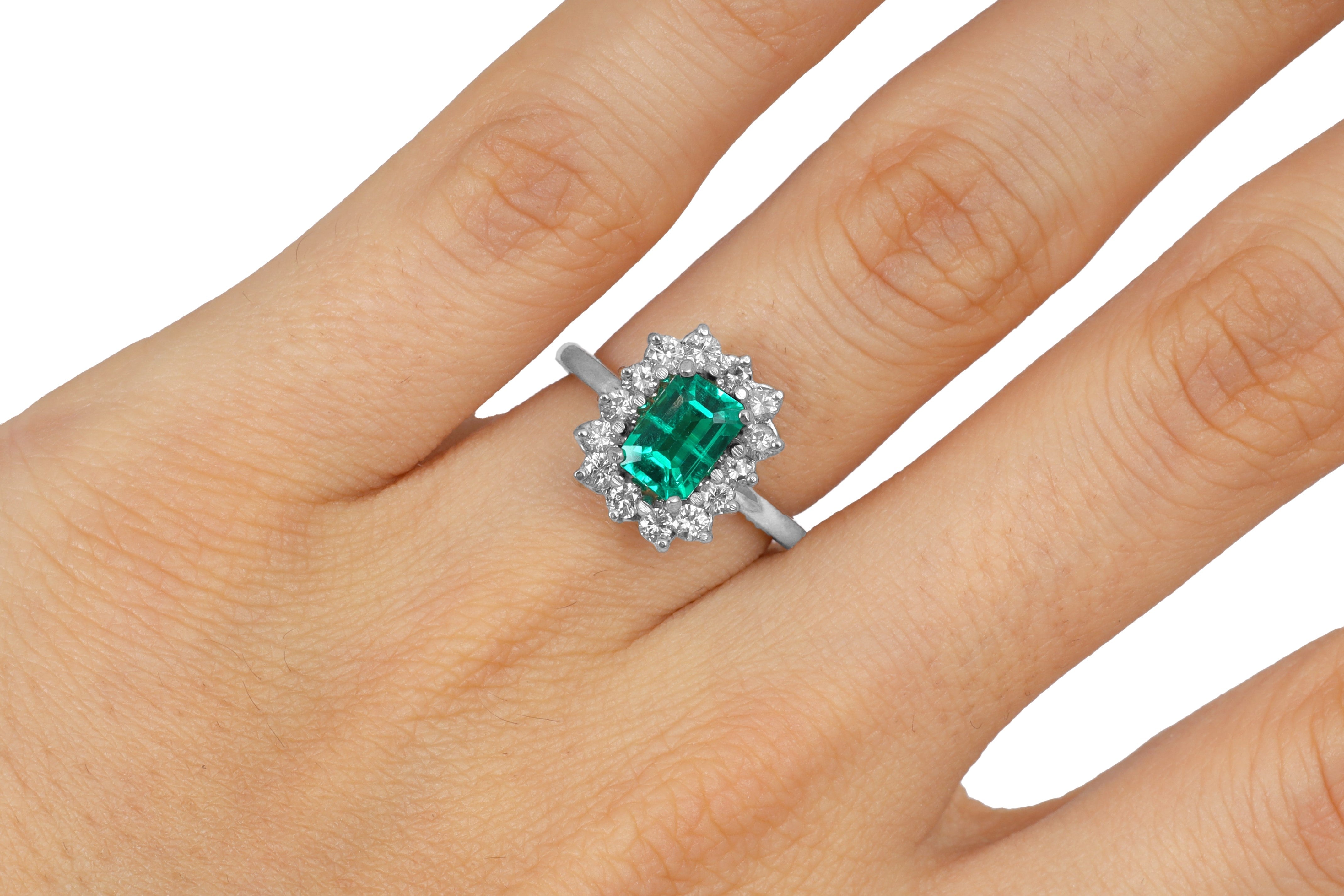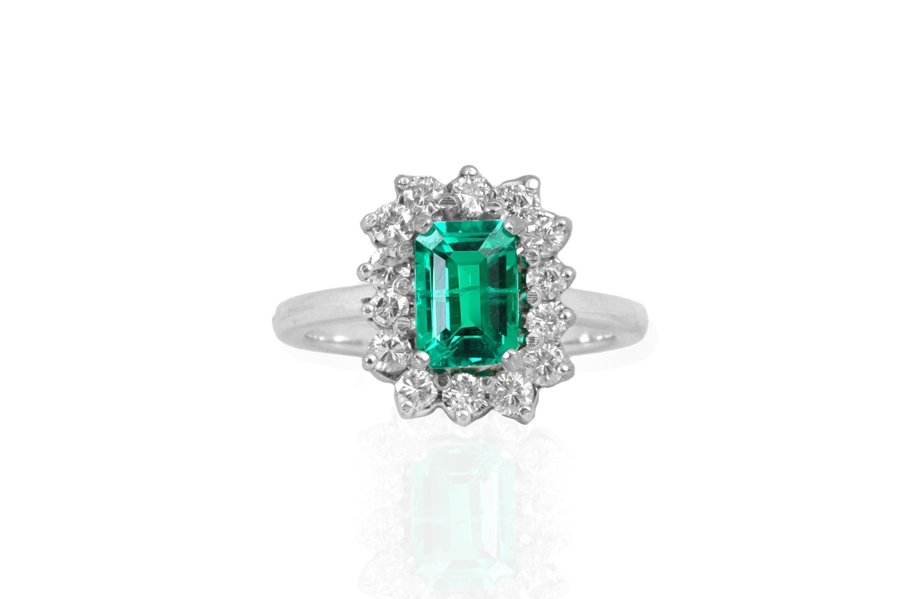 Anillo Oro Blanco Esmeralda 1.00 ct y Diamantes Halo .42 ctw