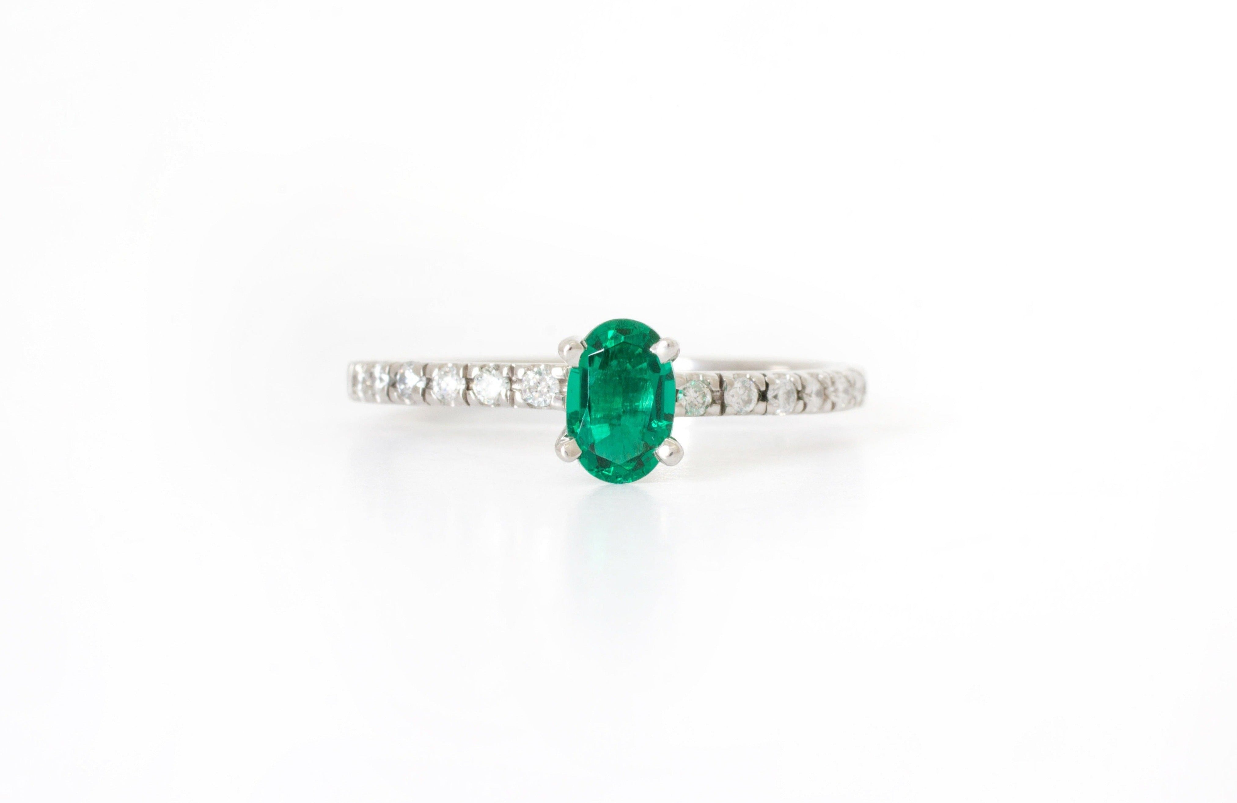 Anillo en oro blanco de 14k con esmeralda tratada de .50 quilates y 12 diamantes laterales de .01 ct (6 diamantes de cada lado) color G, claridad VS.
